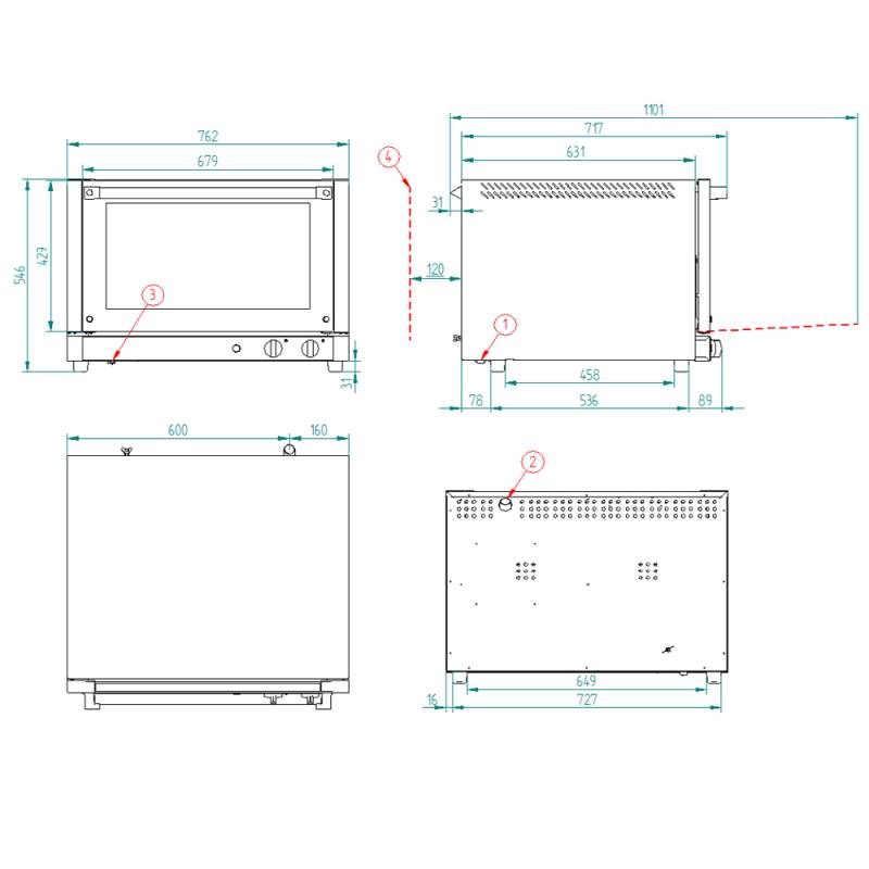 Dimensiones Internas: (An)620 x (F)450 x (Al)350 mmDimensiones Externas: (An)760 x (F)745 x (Al)545 mmPeso: 52 KgTemperatura Máxima: 250º CPotencia Eléctrica: 3.800 WVoltaje: 230 V - 50/60 HzConexión: Schuko MonofásicoCapacidad de Bandejas: 4x600x400 - 4xGN 1/1Distancia entre bandejas: 80 mm