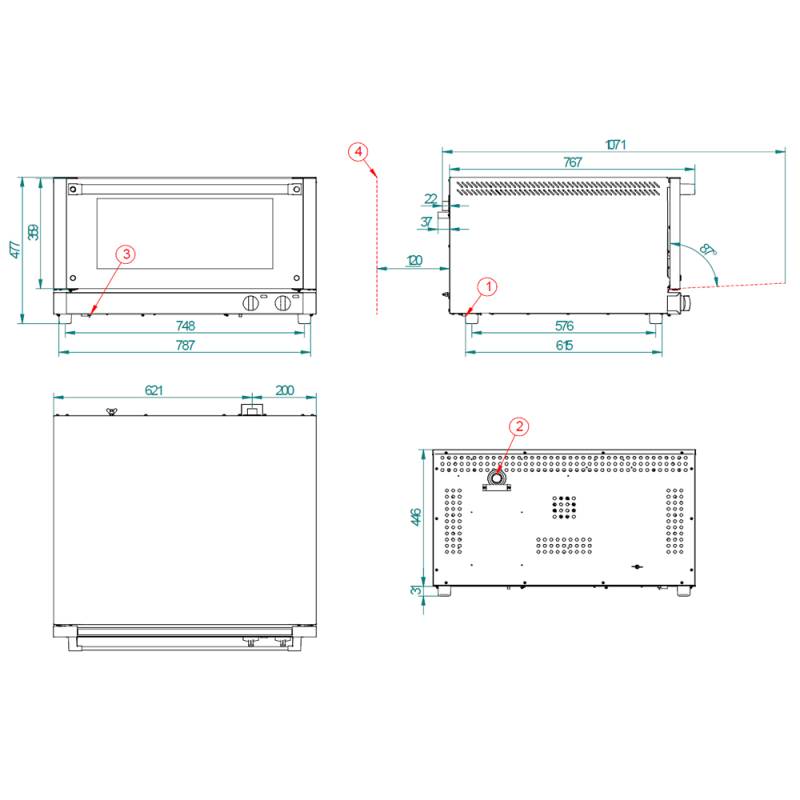 Dimensiones Internas: (An)680 x (F)470 x (Al)285 mmDimensiones Externas: (An)820 x (F)800 x (Al)475 mmPeso: 48 KgTemperatura Máxima: 250º CPotencia Eléctrica: 3.900 WVoltaje: 230 V - 50/60 HzConexión: Schuko MonofásicoCapacidad de Bandejas: 3x600x400 - 3xGN 1/1Distancia entre bandejas: 80 mm