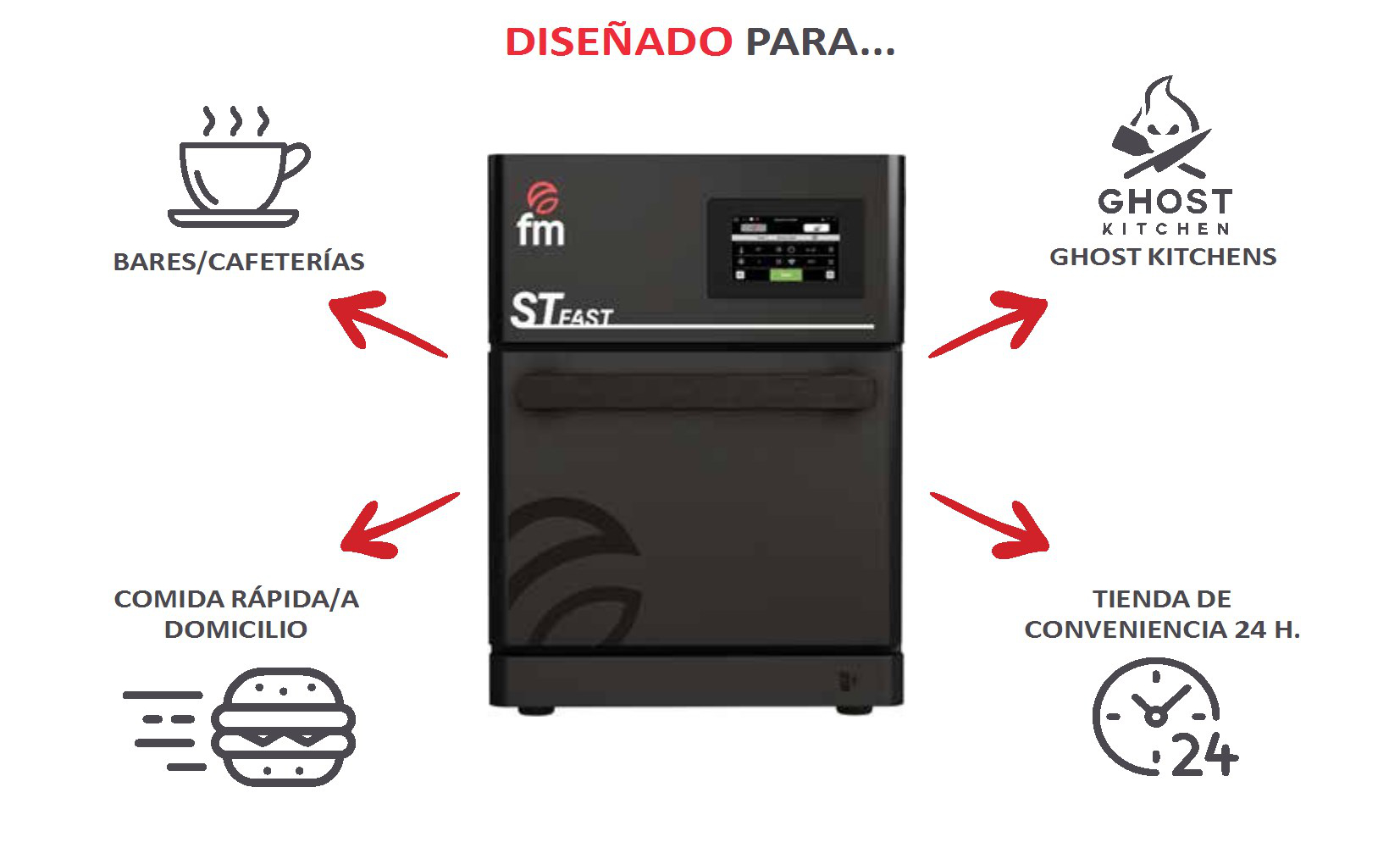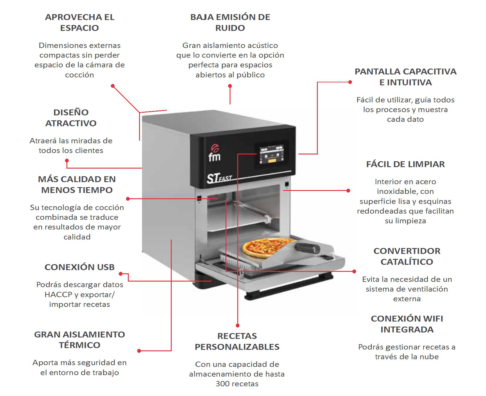 El horno de cocción ultrarrápido ST-Fast reune una combinación de tecnologías para la cocción, tales como la convección, microondas e impigement, lo que garantiza tiempos de cocción inferiores a los hornos convencionales.