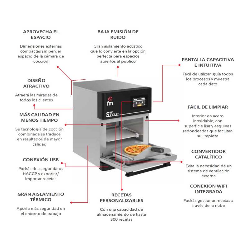 El horno de cocción ultrarrápido ST-Fast reune una combinación de tecnologías para la cocción, tales como la convección, microondas e impigement, lo que garantiza tiempos de cocción inferiores a los hornos convencionales.