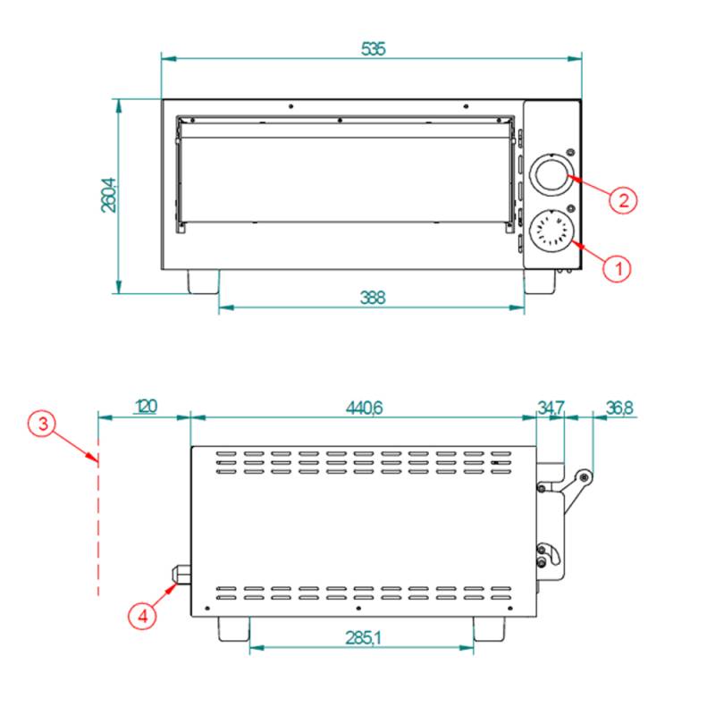 Dimensiones Internas: (An)405 x (F)370 x (Al)80 mmDimensiones Externas: (An)535 x (F)535 x (Al)261 mmPeso: 20 KgTemperatura Máxima: 320º CPotencia Eléctrica: 2.000 WConexión: Schuko monofásicoCapacidad de Bandejas: Distancia entre bandejas: