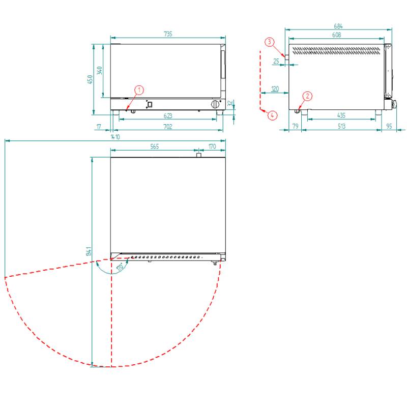 Dimensiones Internas: (An)594 x (F)386 x (Al)240 mmDimensiones Externas: (An)700 x (F)695 x (Al)450 mmPeso: 41KgTemperatura Máxima: 140-160ºCPotencia Eléctrica: 3.900 WConexión: Schuko MonofásicoCapacidad de Bandejas: Distancia entre bandejas: 65 mm