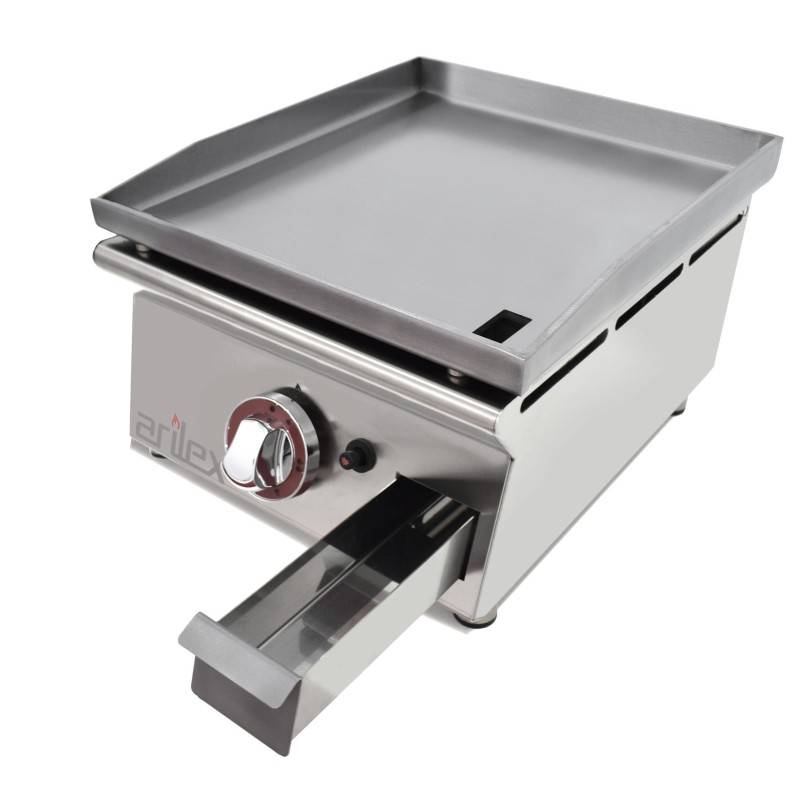 Oferta -40%Plancha de asar de gas Arilex 40PGL acero laminado 6 mm con superficie de 40x40 cm. Ideal para pequeñas y medianas instalaciones. Para uso semi-intensivo. La placa de cocción cuenta con diseño único en el mercado ya que es totalmente extraíble. Peto antisalpicaduras de 36 mm de altura. Dotada de mandos de baquelita de gran calidad con marcador de máximo/mínimo.
