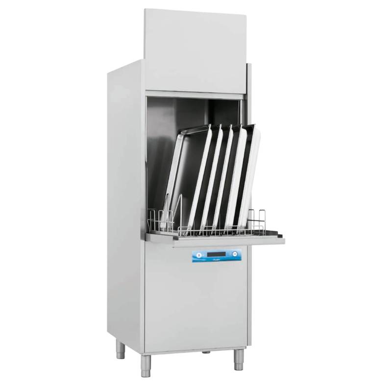 Lavaobjetos con puerta de doble pared y brazos de lavado y aclarado independiente.