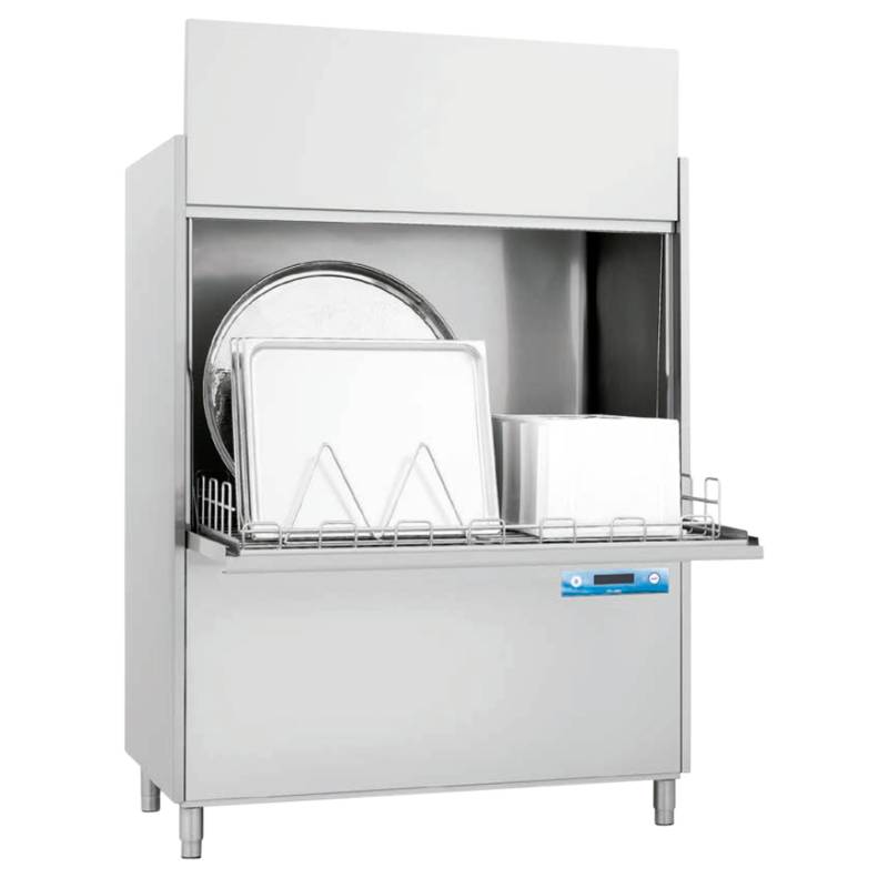 Lavaobjetos con puerta de doble pared y brazos de lavado y aclarado independiente.