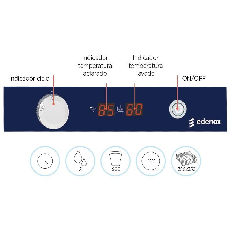 Lavavasos Edenox AV-1200 con cesta de 35 x 35 cm. Intuitivo y muy fácil de usar. Panel de mandos electromecánico con indicadores de temperatura de lavado y aclarado.