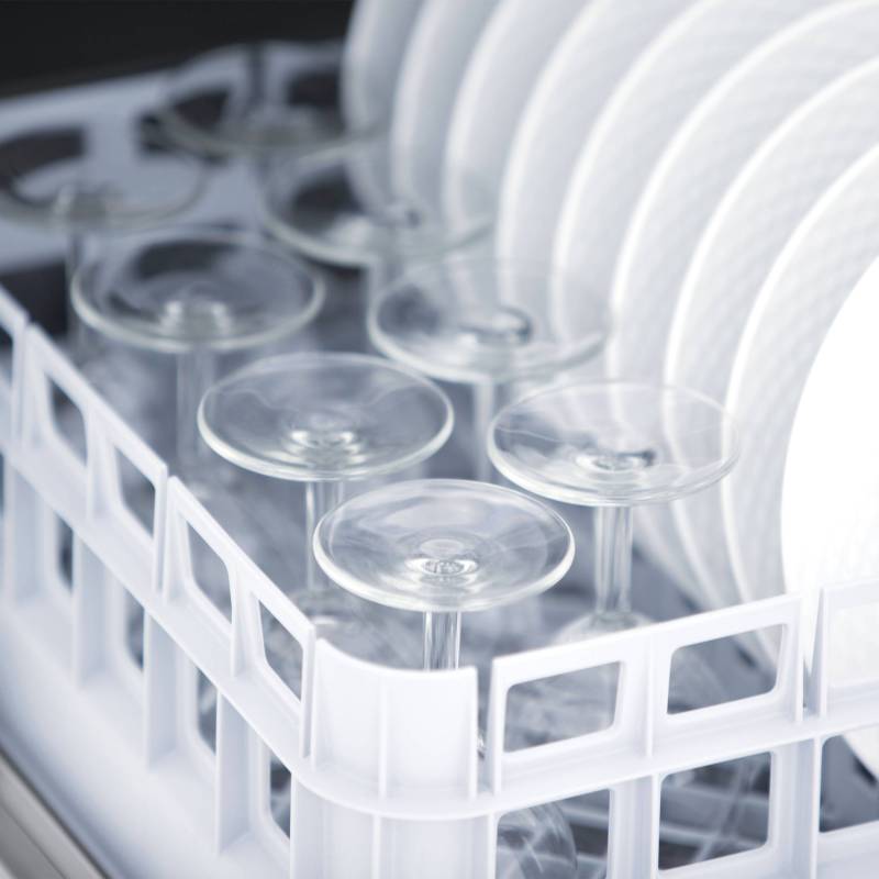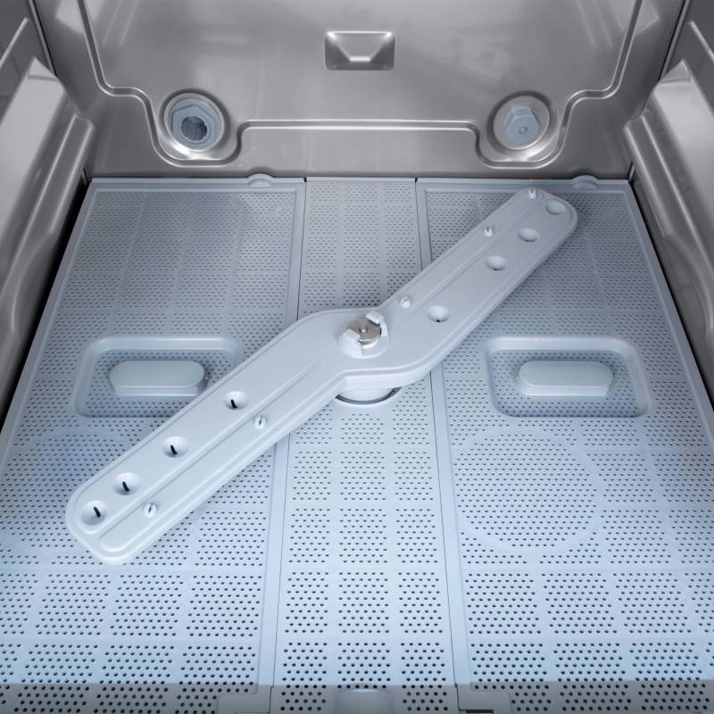 Lavaplatos con puerta de doble pared y brazos de lavado superiores e inferiores.