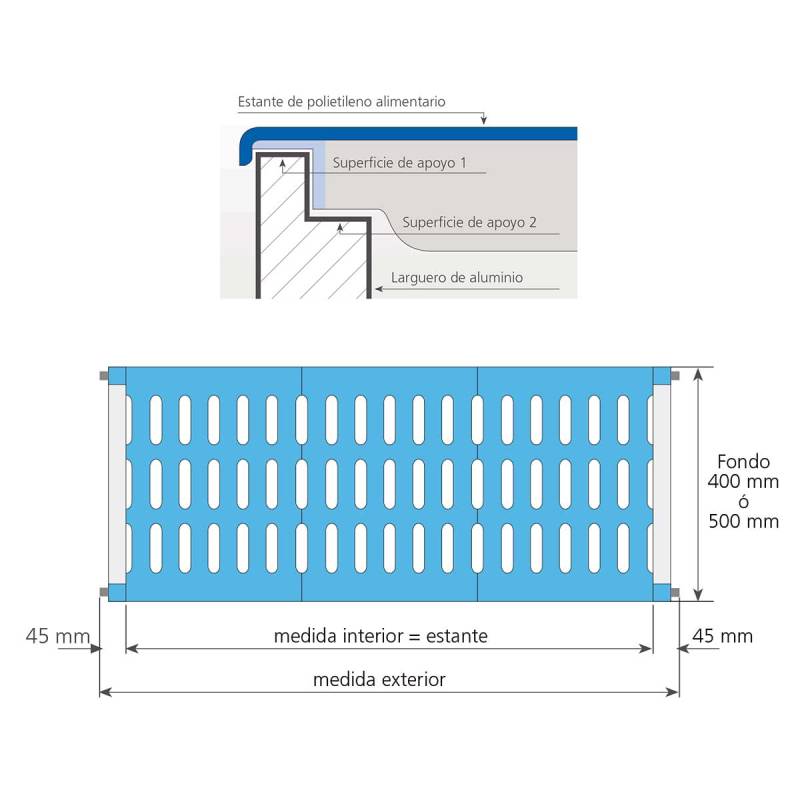 Estantería en angulo con estructura en aluminio anodizado y estantes con parrillas de polietileno. Apta para su uso en cámaras frigoríficas y para el almacenaje de alimentos. Disponible con un ancho de 69 a 580 cm y con fondo de 40 o 50 cm. Su altura es de 175 cm. y se puede configurar con 3, 4 o 5 niveles.