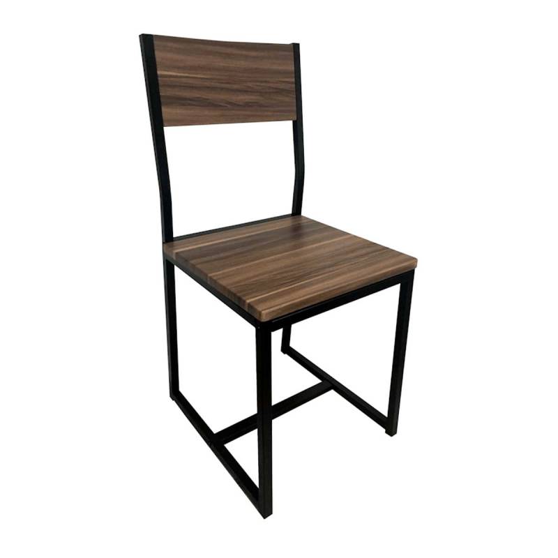 Silla robusta con estructura de hierro. El respaldo y asiento de 18 mm de grosor está fabricado en MDF forrado en PVC color nogal. Tiene unas dimensiones de 38 x 44 x 85 cm. Solo apta para uso en interiores.