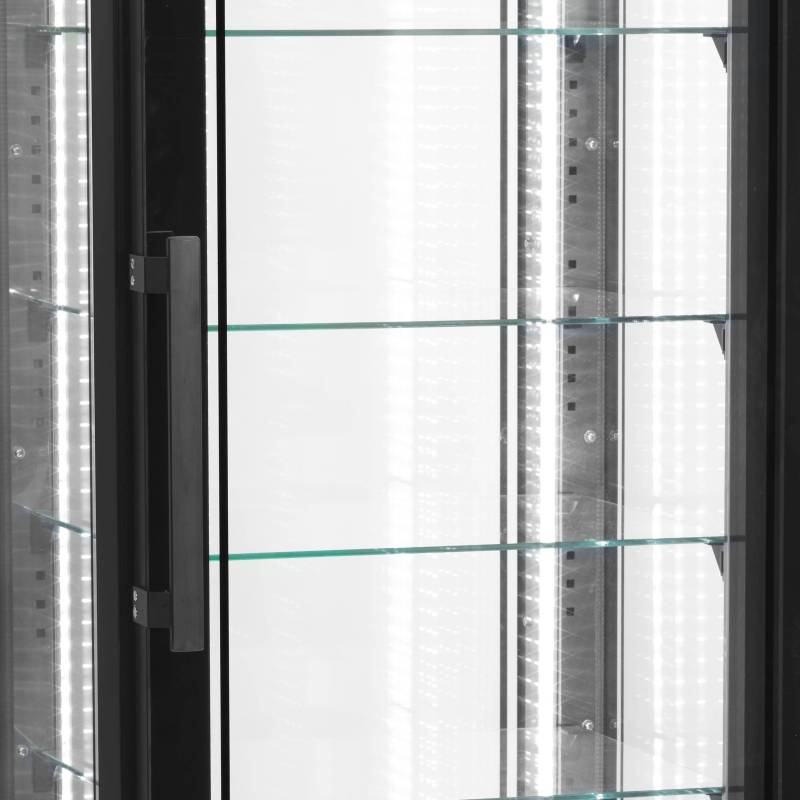 El expositor UPD400-F con puertas de cristal ofrece una elegante solución para la presentación de postres. Este congelador cuenta con doble acristalamiento en los cuatro lados, incluida una puerta de cristal sin marco. Su diseño es moderno, con el exterior en acero negro, el interior en acero inoxidable, 5 estantes de cristal ajustables e iluminación LED.