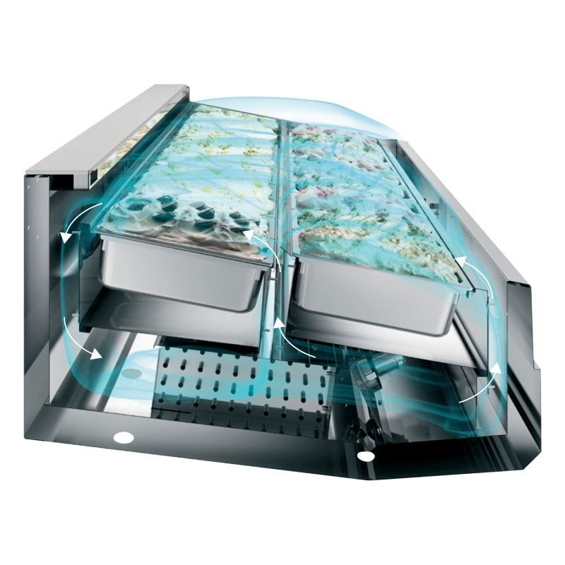 La gama Super Capri de vitrinas para helados ventiladas es ideal para la exposición de helados. Con grandes paneles de cristal e iluminación LED, la presentación de los productos resulta sumamente atractiva. El expositor en ángulo de 11° optimiza la visión, mientras que la refrigeración de doble flujo de aire garantiza una distribución uniforme de la temperatura sobre cada fila de bandejas. El cristal calefactado evita la condensación, mientras que el cristal frontal abatible permite una fácil limpieza. Disponible en varios tamaños.