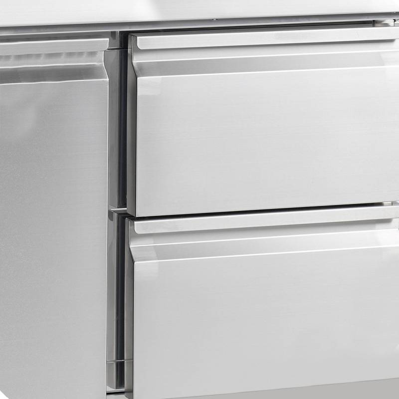 La gama PT de mesas para pizza está realizada en acero inoxidable SS304. Cuenta con una encimera de granito, que es ideal para elaborar pizzas, ya que se mantiene fría y dificulta que la masa se pegue a ella. Están disponibles en varios tamaños con 2 o 3 puertas. También es posible personalizarlas con cajones. Está disponible con o sin unidad de condimentos para bandejas GN1/3 las unidades de condimentos también se pueden incorporar posteriormente.