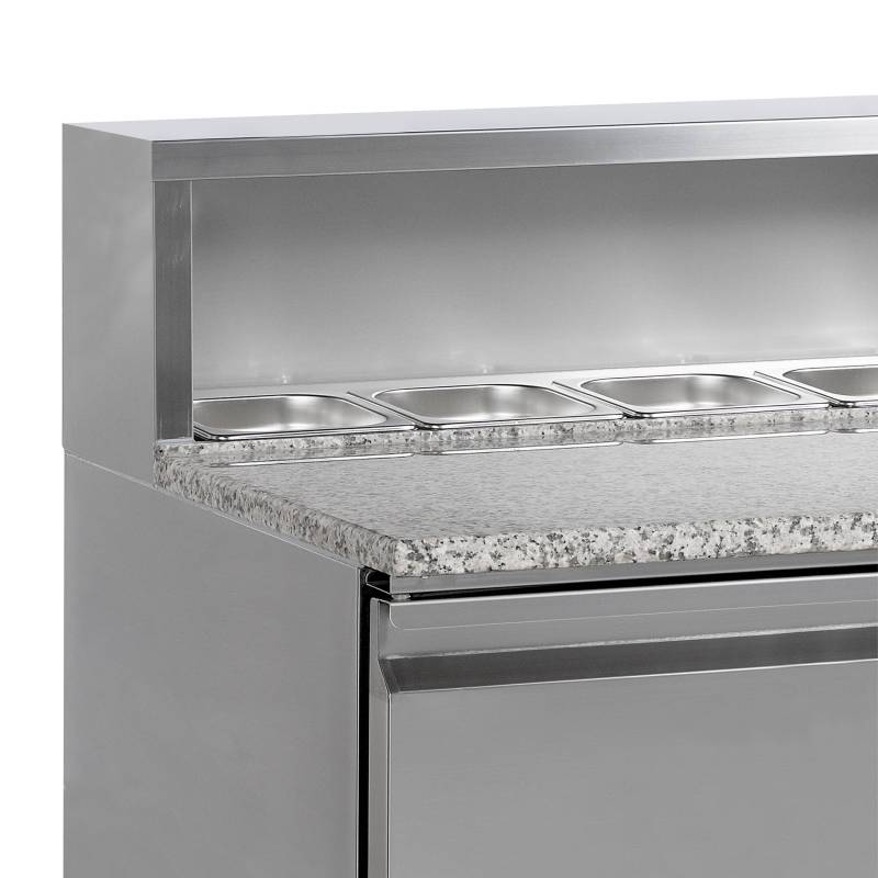 La gama PT de mesas para pizza está realizada en acero inoxidable SS304. Cuenta con una encimera de granito, que es ideal para elaborar pizzas, ya que se mantiene fría y dificulta que la masa se pegue a ella. Están disponibles en varios tamaños con 2 o 3 puertas. También es posible personalizarlas con cajones. Está disponible con o sin unidad de condimentos para bandejas GN1/3 las unidades de condimentos también se pueden incorporar posteriormente.