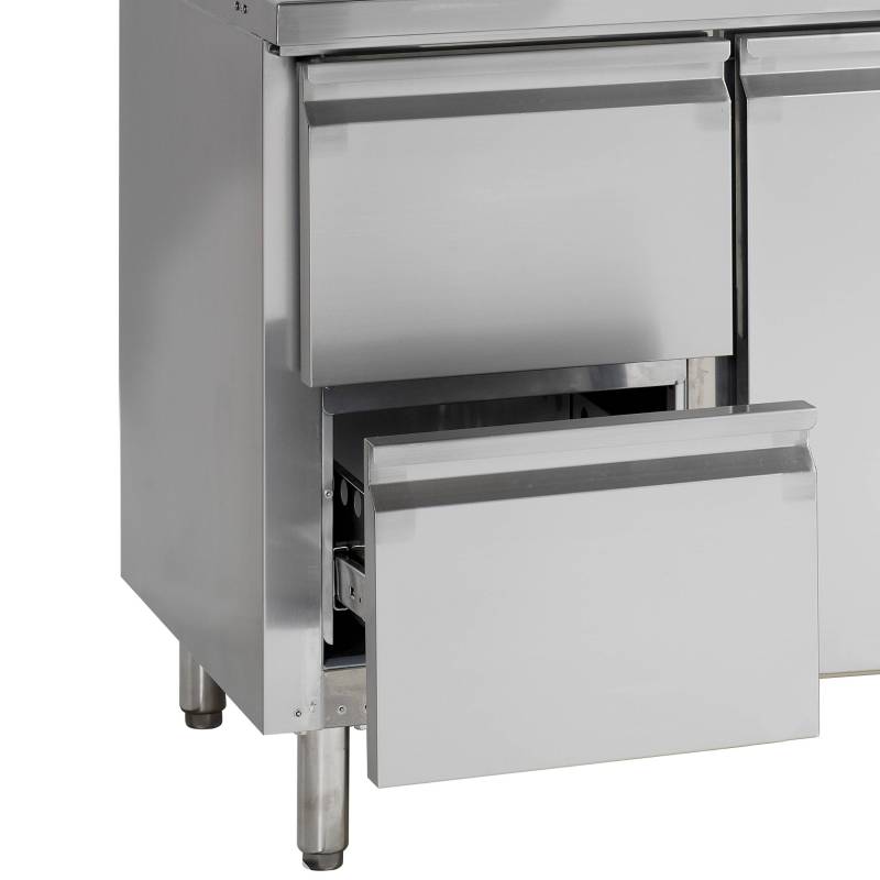 La mesa fría G-line, con una excelente relación calidad-precio, está diseñada con armarios de tamaño GN1/1 y admite a la perfección bandejas Gastronorm. Está realizada en acero inoxidable y es una excelente opción para cocinas industriales. Cuenta con estantes y patas ajustables para una flexibilidad óptima.