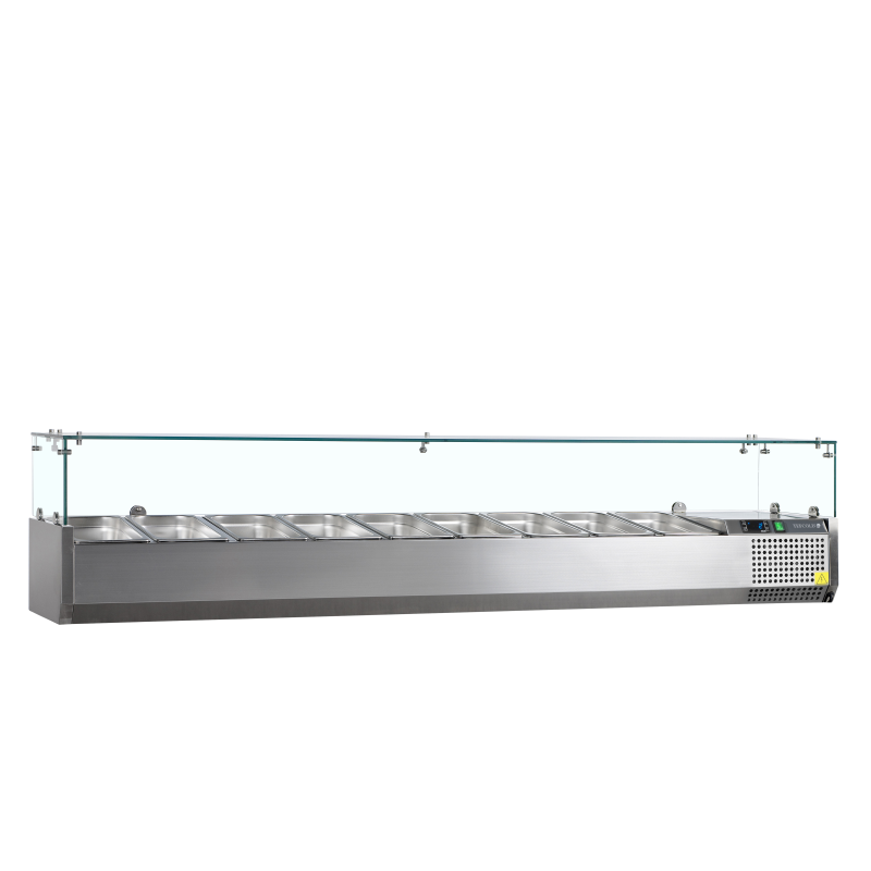 La gama VK de vitrinas refrigeradas es un excelente complemento para mesas frías, ya que te permite tener a mano todo lo necesario para la preparación de alimentos. Es compatible con bandejas GN1/4 y GN1/6 (no incluidas). Este refrigerador está fabricado en acero inoxidable SS304 y presenta pantalla de cristal para proteger los alimentos. Es idóneo para pizzerías, restaurantes de comida rápida y bocaterías.