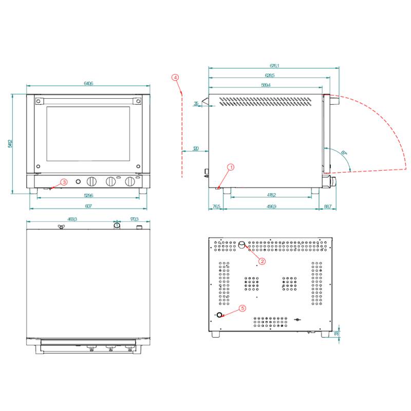 Dimensões internas: (L) 500 x (P) 420 x (A) 345 mmDimensões externas: (L) 640 x (P) 710 x (A) 540 mmPeso: 39 kgTemperatura máxima: 250º CPotência elétrica: 3.100 WTensão: 230V - 50/60HzConexão: Schuko MonofásicoCapacidade da bandeja: 4x480x340 - 4xGN 2/3Distância entre bandejas: 80 mm