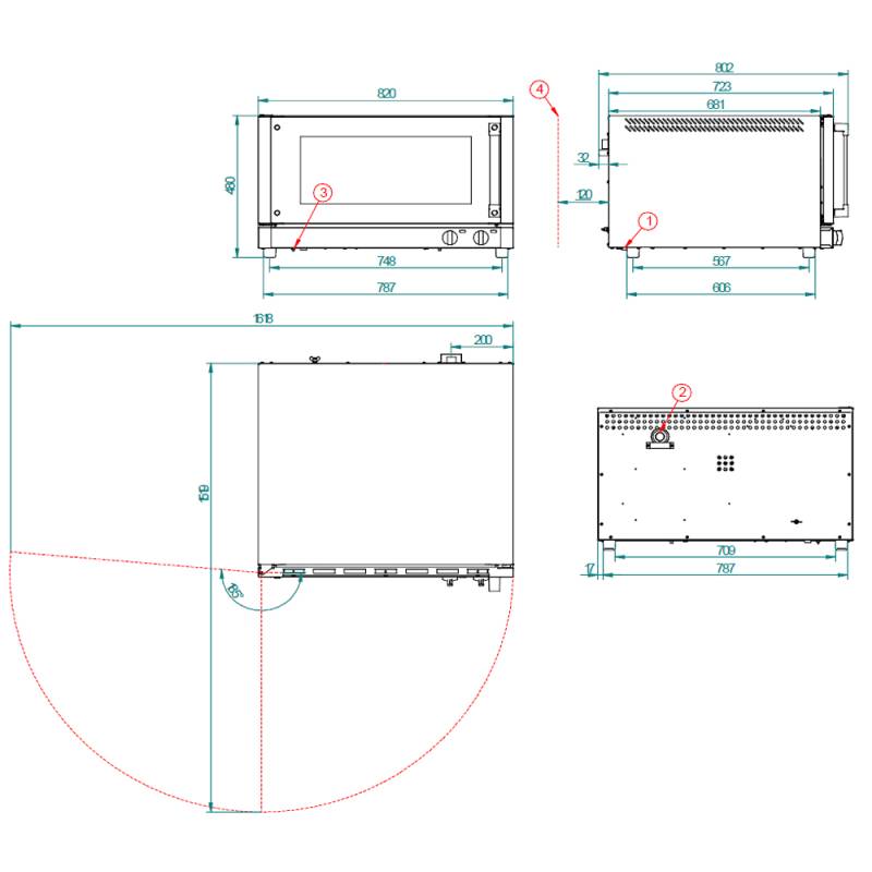Dimensões internas: (L) 680 x (P) 470 x (A) 285 mmDimensões externas: (L) 820 x (P) 800 x (A) 475 mmPeso: 50 KgTemperatura máxima: 250º CPotência elétrica: 3.900 WTensão: 230 V - 50/60 HzConexão: Schuko MonofásicoCapacidade da bandeja: 3x600x400 - 3xGN 1/1Distância entre bandejas: 80 mm