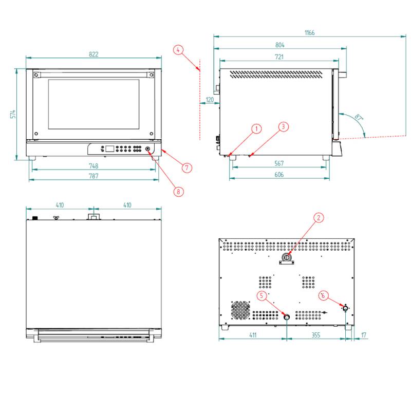 Dimensões internas: (L) 680 x (P) 470 x (A) 365 mmDimensões externas: (L) 820 x (P) 800 x (A) 570 mmPeso: 60 KgTemperatura máxima: 260º CPotência elétrica: 6.000 WTensão: 400 V - 50/60 HzConexão: Trifásico 3F + N + TCapacidade da bandeja: 4x600x400 - 4xGN 1/1Distância entre bandejas: 80 mm