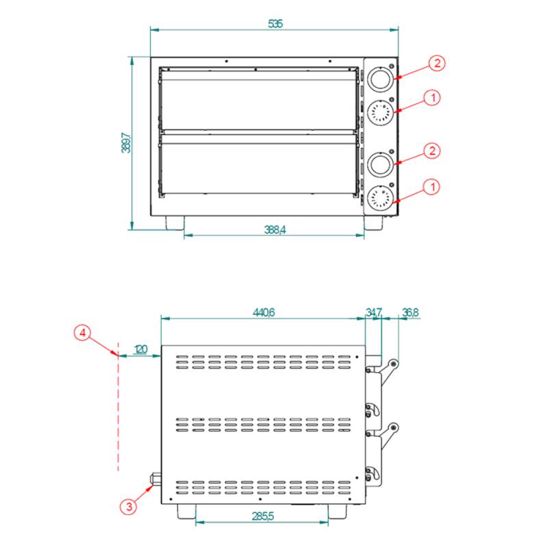Dimensões internas: 2x (W)405 x (D)370 x (H)80 mmDimensões externas: (W) 535 x (D)535 x (H)390 mmPeso: 28 kgTemperatura máxima: 320º CPotência elétrica: 3.000 WConexão: Schuko monofásicoCapacidade da bandeja: Distância entre bandejas: