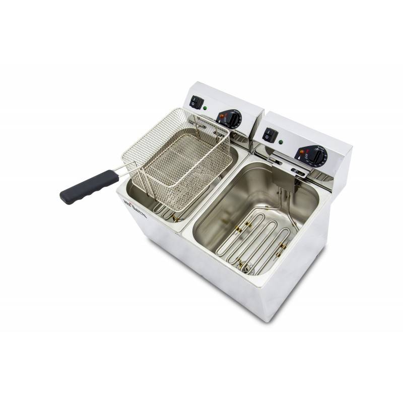 Fritadeira elétrica para indústria com 8+8 litros de capacidade de óleo e 3,5+3,5 kW de potência. Produto de alta qualidade, feito inteiramente de aço inoxidável. Cabeçote destacável para facilitar limpeza. Produto de fabricação nacional.