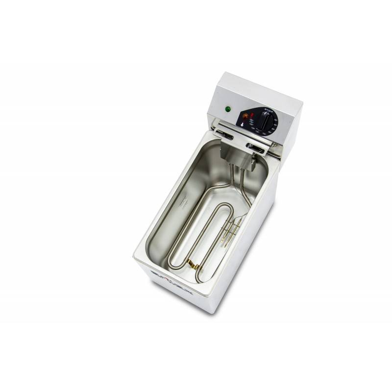 Fritadeira elétrica para indústria com 4 litros de capacidade de óleo e 2,2 kW de potência. Produto de alta qualidade, feito inteiramente de aço inoxidável. Cabeçote destacável para facilitar limpeza. Produto de fabricação nacional.