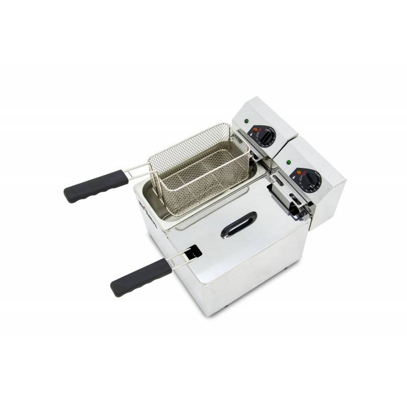 Fritadeira elétrica com 4+4 litros de capacidade de óleo e 2,2+2,2 kW de potência. Produto de alta qualidade, feito inteiramente de aço inoxidável. Cabeçote destacável para facilitar limpeza. Produto de fabricação nacional.