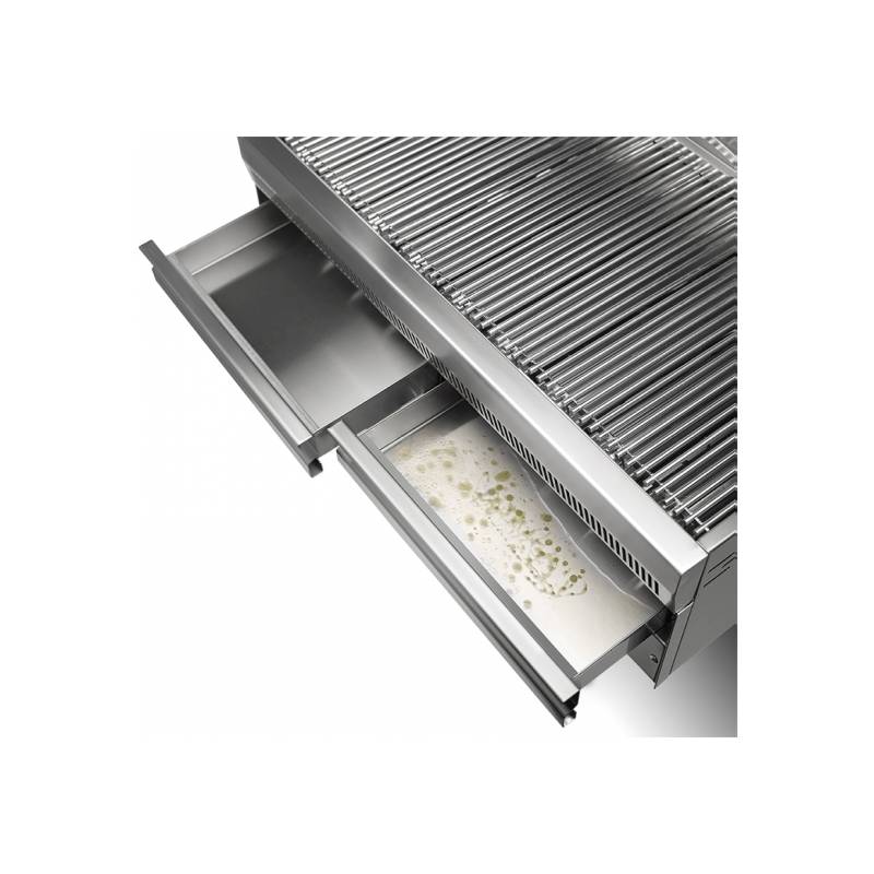 Grelhador a gás com superfície inferior com água que remove 80% de fumaça, ideal para cozinhas com capacidade de sucção limitada.