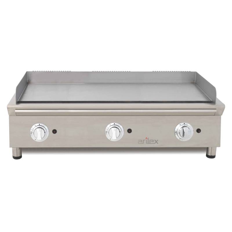 Frytop a gás profissional do fabricante ARILEX 100 cm de largura com uma superfície de cozimento de aço moído de 15 mm de espessura. Feito em Espanha com materiais de alta qualidade.