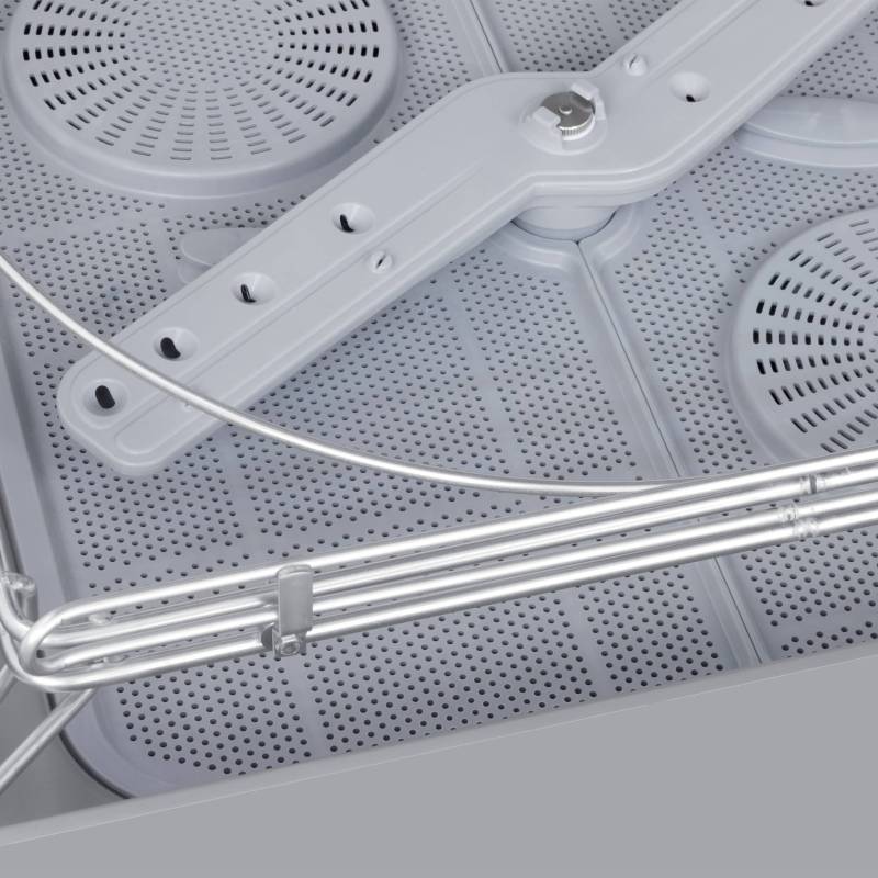 Máquina de lavar louça com porta de parede dupla e braços de lavagem superiores e inferiores.