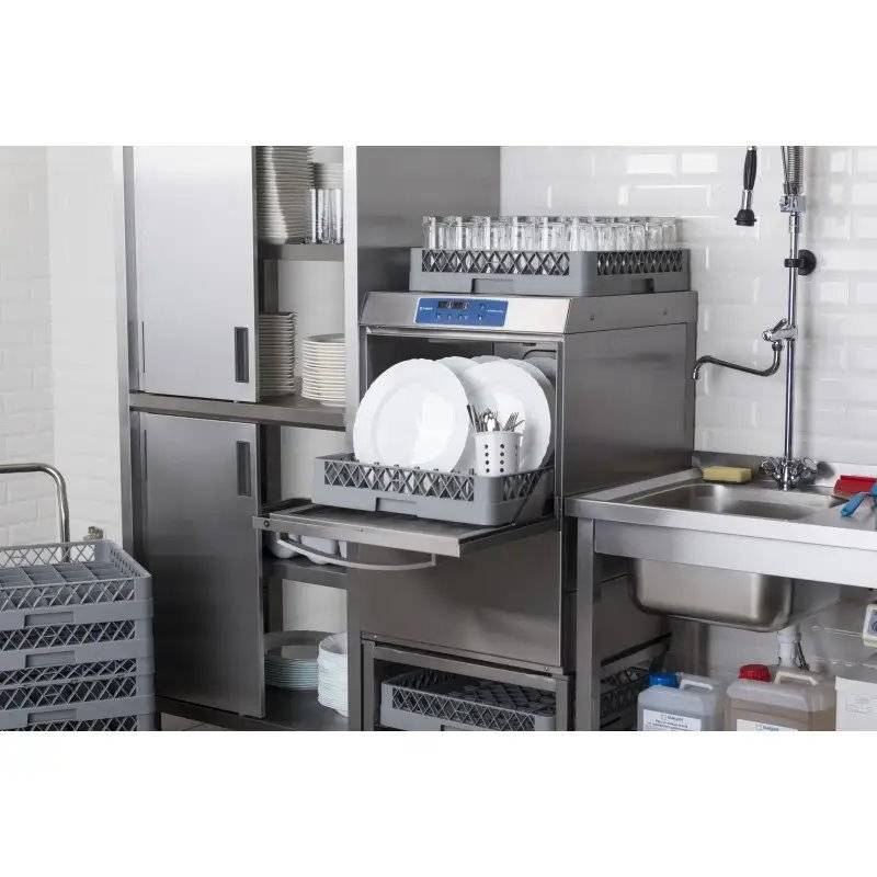 Máquina de lavar louça industrial para uso hotelaria. Com uma potência de 4,9/3,4 kW (ajustável de acordo com a tensão da sala) e com duas durações de lavagem; 120 ou 180 segundos.