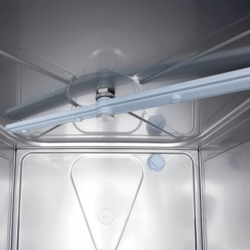 Lavadora de vidro com porta de parede dupla e braços de lavagem superiores e inferiores.