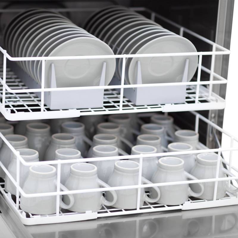 Máquina de lavar loiça com porta de parede dupla e braços superiores e inferiores para lavar.