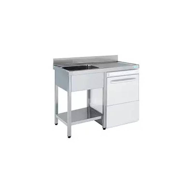 Pia industrial com estrutura inferior 550. Projetado para incorporar uma máquina de lavar louça padrão ou lavadora de vidro sob o escorredor de gastos. Feito inteiramente de aço inoxidável AISI 304 18/10 de alta qualidade para longa vida. Cuba com isolamento acústico. Disponível em dois tamanhos diferentes e equipado com pernas ajustáveis para fixar a altura entre 850 mm e 900 mm.