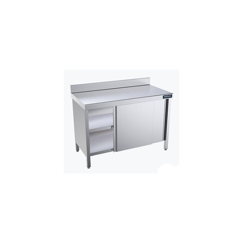 Mesa de trabalho prática com portas de correr de 90 cm de profundidade e 85 cm de altura. Fabricado em aço inox acetinado AISI 304 18/10. Disponível em diferentes tamanhos nas versões central e de parede. Portas articuladas no modelo de 80 cm de largura. Fornecido montado.