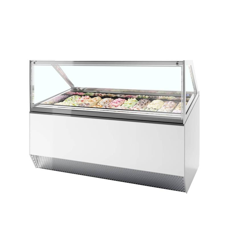 La gama Millennium LX de vitrinas expositoras de helado está disponible en tamaños aptos para 12 a 24 bandejas Napoli. Así, este equipo de alta gama con elegante cristal curvado es capaz de mostrar una amplia variedad de deliciosos sabores. El eficiente sistema de refrigeración asistido por ventilador garantiza una refrigeración homogénea de su gelato o crema de helado, con lo cual la temperatura se mantiene perfecta para formar las bolas. El cristal está calefactado para evitar la condensación, y además hay una cortina de enfriamiento.
