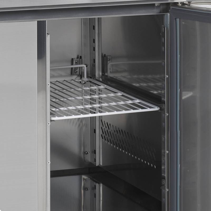 A mesa fria G-line, com uma excelente relação qualidade-preço, é projetada com armários tamanho GN1/1 e suporta perfeitamente as bandejas Gastronorm. É feito de aço inoxidável e é uma excelente escolha para cozinhas industriais. Possui prateleiras e pernas ajustáveis para uma flexibilidade ideal.
