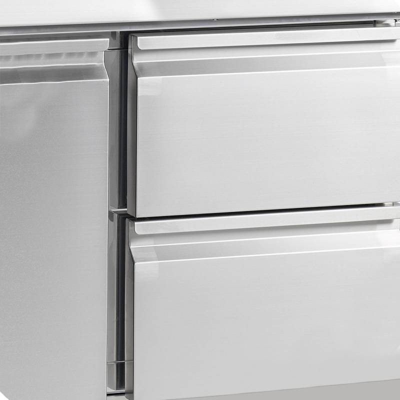A gama PT de mesas de pizza é feita de aço inoxidável SS304. Tem uma bancada de granito, que é ideal para fazer pizzas, pois fica fria e dificulta a aderência da massa. Estão disponíveis em vários tamanhos com 2 ou 3 portas. Também é possível personalizá-los com gavetas. Está disponível com ou sem unidade de tempero para bandejas GN1/3, unidades de tempero também podem ser incorporadas mais tarde.