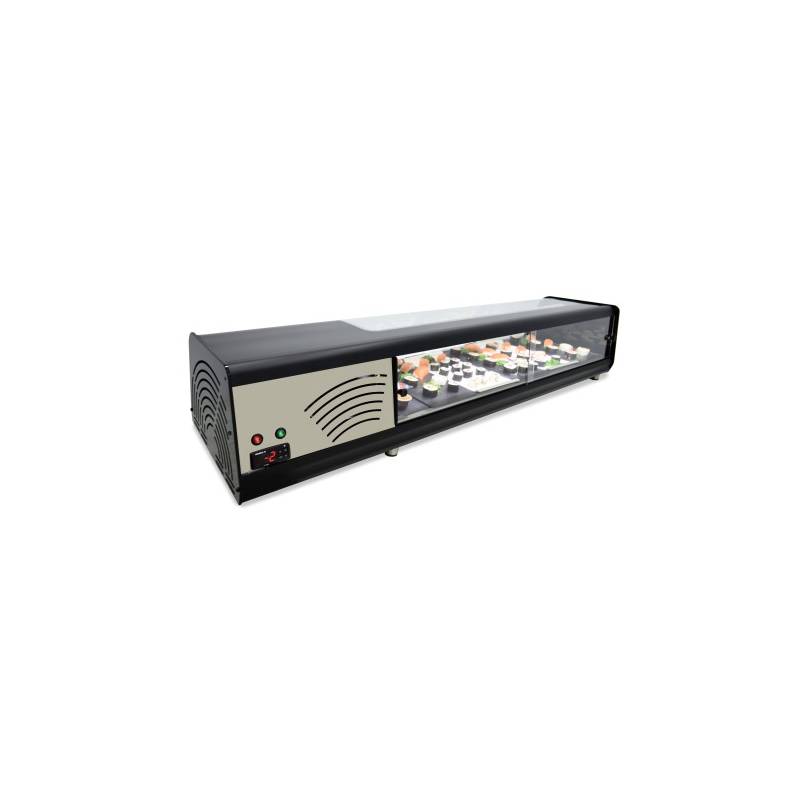 • Vitrine refrigerada estática criada especialmente para sushi, peixe ou similar. Equipado com 3 evaporadores de tubo de cobre: Uma placa fria inferior e outra 2 tubulares estáticas superiores tipo com acabamento cromado e bandeja de gota removível.
