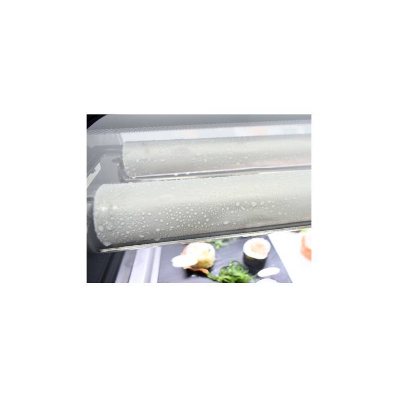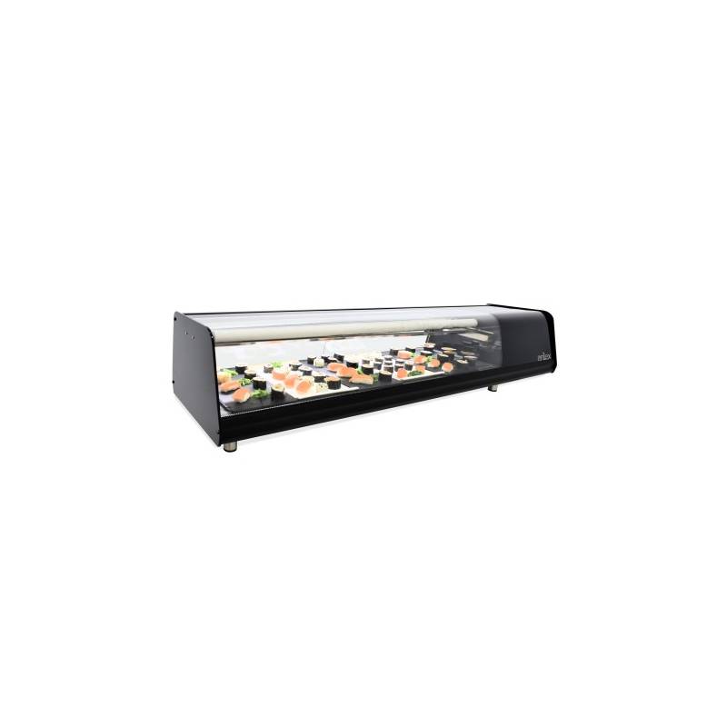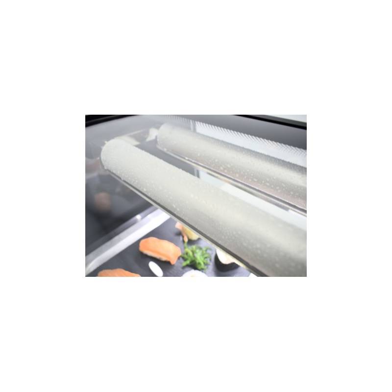 • Vitrine refrigerada estática criada especialmente para sushi, peixe ou similar. Equipado com 3 evaporadores de tubo de cobre: Uma placa fria inferior e outra 2 tubulares estáticas superiores tipo com acabamento cromado e bandeja de gota removível.
